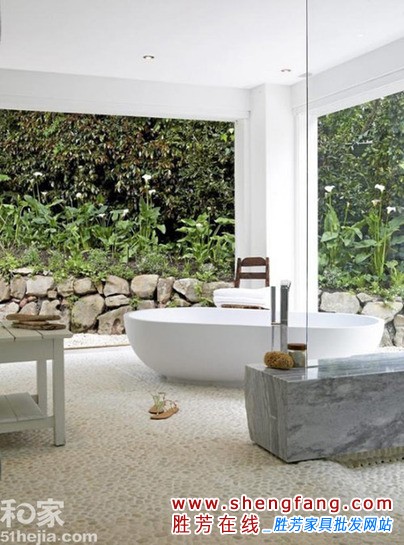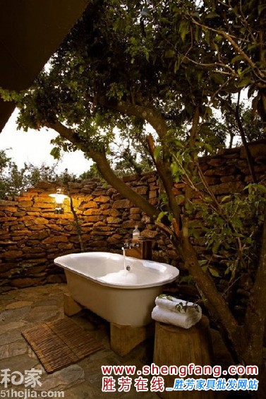 小编的话:一圈石头墙面将卫浴空间很好的和外面的空间隔离出来,半包围的样式保留了自然的气质同时又不会过于暴露。两块木板垫在浴缸下方,后方的实木也是卫浴间的自然装饰。