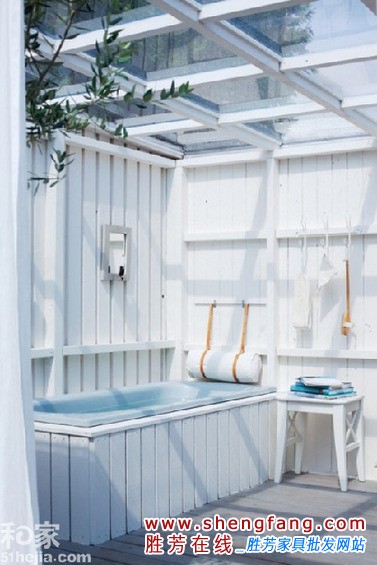 小编的话:不能接受完全裸露的洗浴空间,那么不妨在卫浴周围圈上一层木制墙。白色的墙体上方是漂亮的玻璃窗,阳光从头顶肆意洒进,将下方淡蓝色的浴缸也照耀的别样清新。一旁的绿色也是很好的点缀。