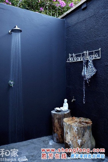 小编的话:深蓝色的墙面在充足的光线下,整个的空间都非常舒适,两个木墩是放肥皂之类的不错之地。墙面上白色的挂钩拼成了艺术的字母造型,露天的墙体上方红色的花朵是空间色彩的最好点缀。