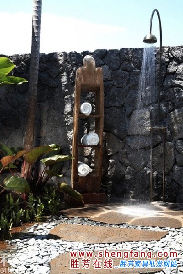 小编的话:整个空间都是石头的天下,除了墙面是石块的累积,地面上也是大大小小的石头和鹅卵石铺成的。极富野性的淋浴器很复古很原始,但是可以看出水流还是不小的。一旁的毛巾架也是非常个性的装饰