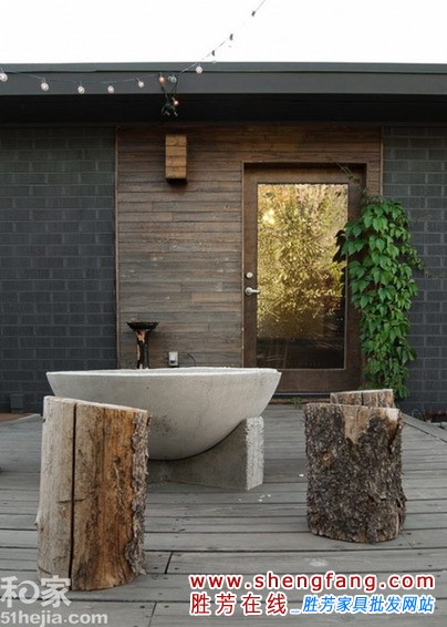 小编的话:大自然的好处就在于任何东西只要加以利用都能找到最好最合适的位置。树墩可以当成木板凳,而中央水泥样式的浴缸也是最原始最自然的设计。后方墙上的藤蔓给低沉的色调添加了不少活力。