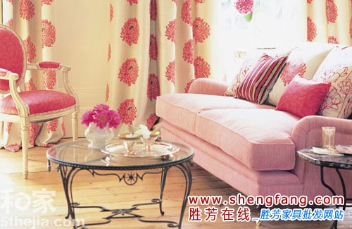 桃红色花朵图案窗帘搭配同色系的座椅,点缀着一旁的桃红色的花朵,虚实结合。古典的梳妆台和镜子,使这个客厅空间呈现出了浪漫温馨的格调。