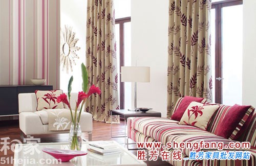暗红色的条纹沙发和同色系的条纹墙纸,相映成趣,条纹墙纸能起到拉伸空间的视觉效果。紫色的窗帘。更是给空间增添了高雅的格调。
