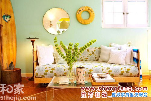 淡绿色的墙壁,素雅的绿色小花图案的坐垫,使整个客厅弥漫着田园的氛围。用圆形镜子和环形装饰物装点沙发背景墙,别致而有新意。