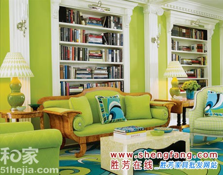 绿色是如今不少年轻人喜爱的色彩,鲜嫩的绿色给人以青春的活力。原木质地沙发搭配绿色的坐垫,充满了自然的清新。两个嵌入式的书架,巧妙地借用了空间