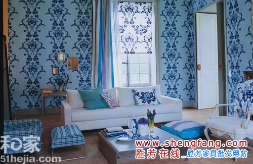 清爽的蓝色照样也能成为婚房的色彩,精致图案的墙纸和罗马帘,使这个客厅呈现出了地中海的浪漫温情。白色沙发上摆上蓝色的靠垫,和整体风格相统一。