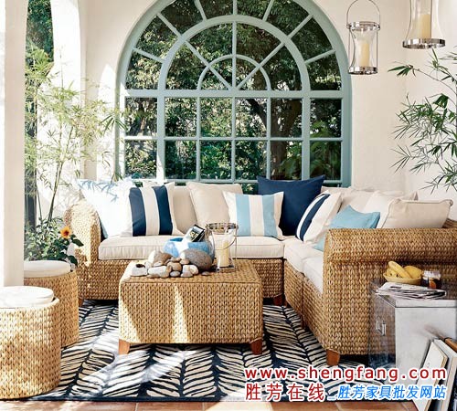 如果有自家的庭院,可以将藤制沙发摆在这里,当然有落地窗的客厅或阳台也有同样的效果。搭配青翠的绿色植物,迎接天光的沐浴。印上棕榈叶的蓝白地毯和装饰用的鹅软石,幻化出东南亚海岛的旖旎风情