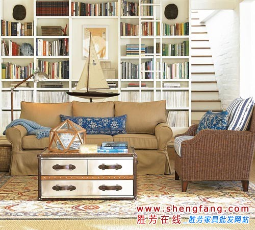 炎炎夏日,不妨用蓝色印花长抱枕代替纯色抱枕,营造出舒适随意的感觉,搭配自然风情的藤椅和帆船装饰,带来大海的宁静浪漫。皮箱式的茶几,让人自然联想到远航的心情,带着轻松自在感享受客厅的午后。