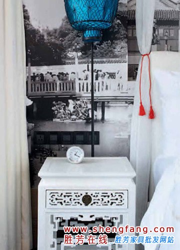 中式传统镂空花纹设计的白色床头柜,配以蓝色灯笼式的床头灯,营造出充满风韵的柔软中国风。