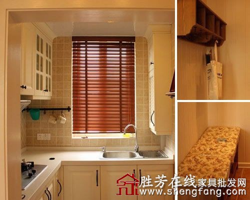 整个厨房空间采用白色基调和原木家具,显得简洁有型。木质的餐台带来了自然的味道,为了防止单调,双重色彩的地面和背景墙呼应,为厨房增加了变化的情趣。