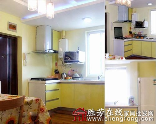 餐厨相连,迷你的小厨房,开放式的设计,麻雀虽小五脏俱全。黄绿色的橱柜,清新而自然。