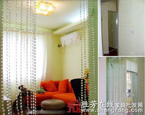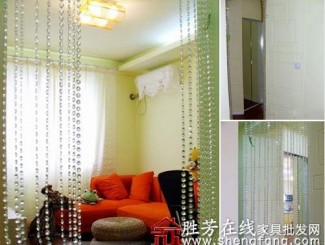 餐厨通向客厅的过道里,设计了一玻璃门储物柜。客厅入口处,挂了一个晶莹梦幻的珠帘,非常艺术与剔透的装饰。
