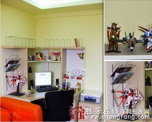 客厅的一角就是书房功能区,简约的书桌书架,上面摆放了男主人收藏的高达和圣斗士,充当了摆饰。