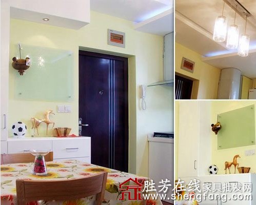 右边是一时尚简约的白色鞋柜,鞋柜的顶面摆了一足球和骏马的装饰品,小竹筐则用来放钥匙。磨砂玻璃留言板,方便简约。宜家的实木餐桌,铺上温馨素雅的向日葵餐桌布,时尚简约的三头餐厅吊灯。