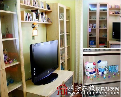 电视墙这一边摆放了书架作为背景墙,书架上摆放了很多女主的可爱小饰品和书籍,简单的收纳与装饰。
