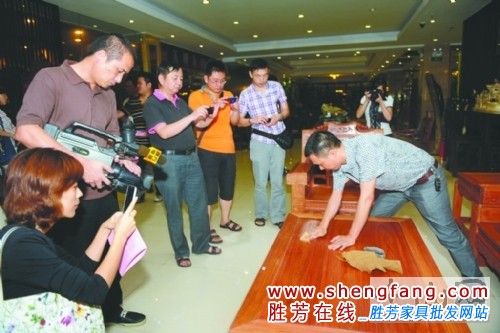 在通报会现场,"波记"家具老板用磨砂纸打磨家具表面。记者黎旭升摄